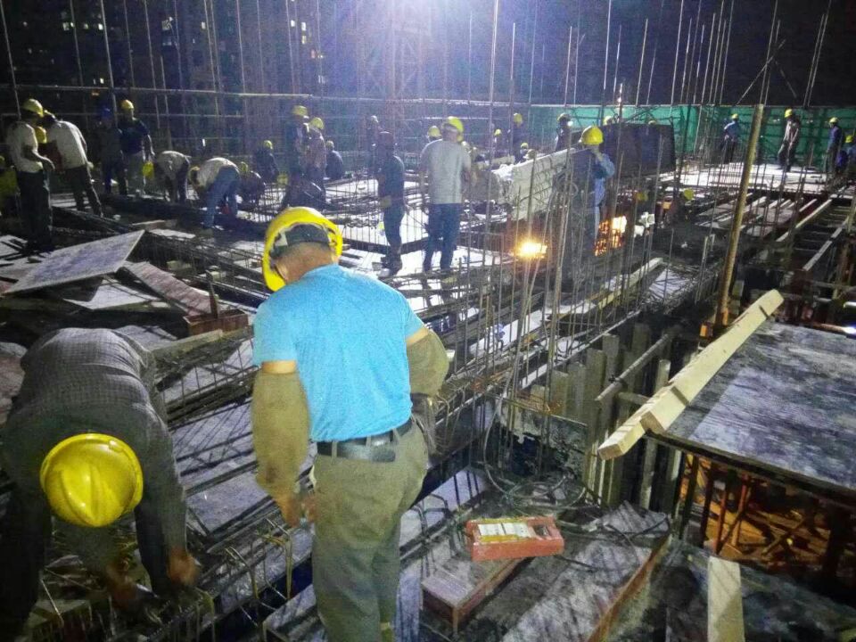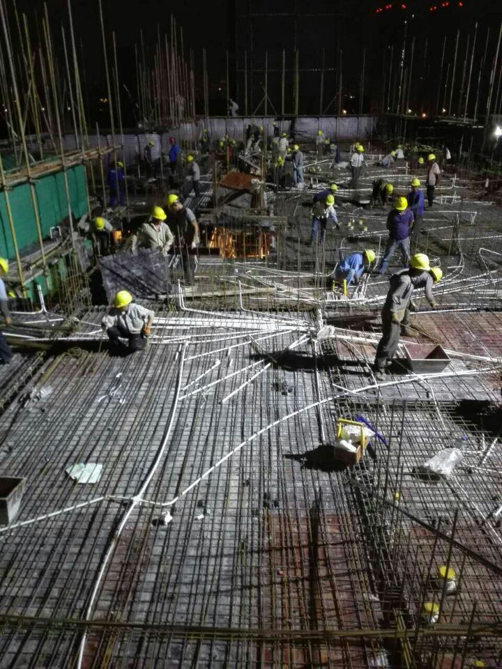 客戶的要求就是使命。江蘇華建上海公司本著“客戶至上”的原則,立即成立臨時指揮部,上海公司蘇南分公司、第八工程處全員出動,在短短的一個小時內完成了施工方案制訂、班組人員協調和設備材料到位等全部準備工作。配置鋼筋工46人、木工78人、瓦工18人、水電工23人。30日上午9點,開始墻柱鋼筋綁扎作業,并在3小時內完成任務,期間同時穿插木工搭設排架、安裝墻板等施工作業。下午2模板頂板鋪設基本完成,水電工2小時內完成水電預埋。下午6木工用時2小時完成吊模作業;實測實量組和項目部所有質檢員全程跟蹤檢查驗收,嚴把工程質量關夜間10完成問題整改使之具備砼澆筑條件31日凌晨4七層主體工程砼澆筑工作全部完成,也由此創造出江蘇華建上海公司24小時澆筑一層樓的施工新速度。