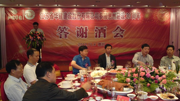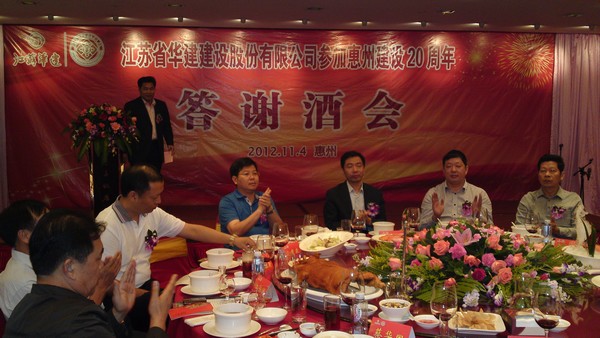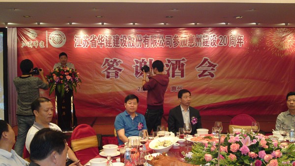 11月4日,公司在惠州凱賓斯基酒店王子飯店隆重召開參加惠州建設(shè)20周年慶典暨答謝酒會,公司副董事長、總經(jīng)理宗有農(nóng)主持酒會并作開場致辭。惠州市有關(guān)政府部門、部分合作方企業(yè)的負(fù)責(zé)人,華建聯(lián)盟成員單位負(fù)責(zé)人,公司董事、監(jiān)事和高管等130余人出席慶典。惠州公司總經(jīng)理華恒榮介紹了公司參加惠州建設(shè)20年的有關(guān)情況。惠州市工商聯(lián)主席、公司戰(zhàn)略合作伙伴恒宇實(shí)業(yè)集團(tuán)公司董事長楊滿芳代表合作方發(fā)言,惠州市住房和城鄉(xiāng)規(guī)劃建設(shè)局副局長陳訓(xùn)政代表政府主管部門致辭,分別對江蘇華建進(jìn)駐惠州施工、參加惠州建設(shè)20周年表示祝賀。公司董事長陸金龍代表公司總部對惠州市有關(guān)政府部門、相關(guān)合作方和社會各界人士給予公司的關(guān)心和支持表示誠摯的感謝,并表達(dá)了進(jìn)一步加大支持力度、加強(qiáng)戰(zhàn)略合作、加快科學(xué)發(fā)展的意愿。