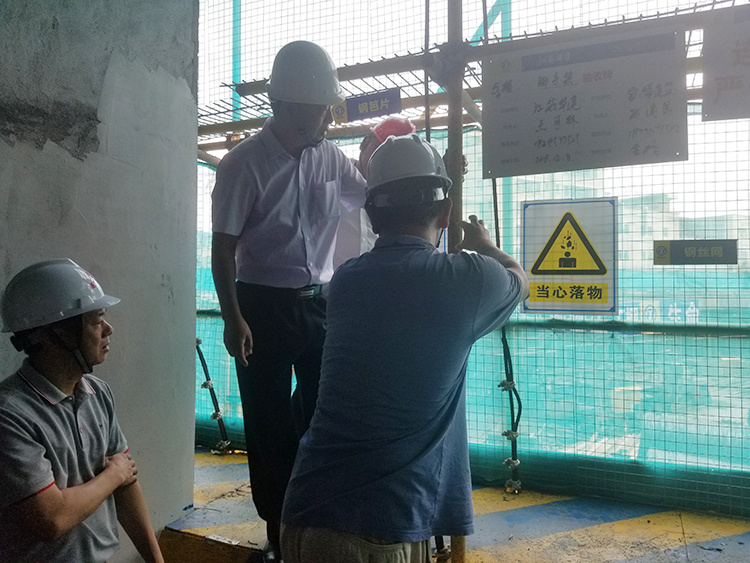圖為商局聽取溫局和惠陽區(qū)施工安全監(jiān)督站陳永祥站長介紹腳手架安全網(wǎng)內(nèi)側(cè)張掛“鋼絲網(wǎng)”防護(hù)情況