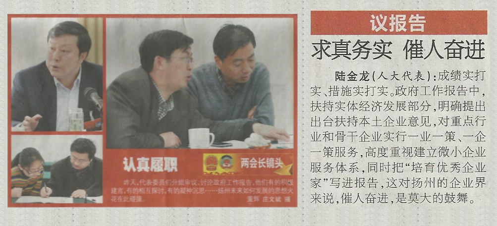 元月7日的《揚(yáng)州日報(bào)》焦點(diǎn)新聞欄目報(bào)道了我公司董事長陸金龍參加揚(yáng)州市七屆人大二次會議的有關(guān)情況。本次人代會6日上午在揚(yáng)州會議中心隆重開幕,作為市人大代表,陸董事長在會上認(rèn)真參與對朱民陽市長代表政府所作工作報(bào)告的討論,并圍繞“六個(gè)基本”抓發(fā)展、合力推進(jìn)“三個(gè)揚(yáng)州”和世界名城建設(shè)、加快建設(shè)更高水平小康社會積極建言獻(xiàn)策。《揚(yáng)州日報(bào)》在人大代表“議報(bào)告”中第一個(gè)刊登了陸董事長的發(fā)言:“成績實(shí)打?qū)崱⒋胧?shí)打?qū)崱Uぷ鲌?bào)告中,扶持實(shí)體經(jīng)濟(jì)發(fā)展部分,明確提出出臺扶持本土企業(yè)意見,對重點(diǎn)行業(yè)和骨干企業(yè)實(shí)行一業(yè)一策、一企一策服務(wù),高度重視建立微小企業(yè)服務(wù)體系,同時(shí)把‘培育優(yōu)秀企業(yè)家’寫進(jìn)報(bào)告,這對揚(yáng)州的企業(yè)界來說,催人奮進(jìn),是莫大的鼓舞。”