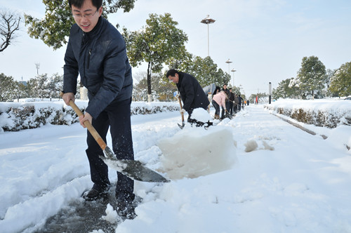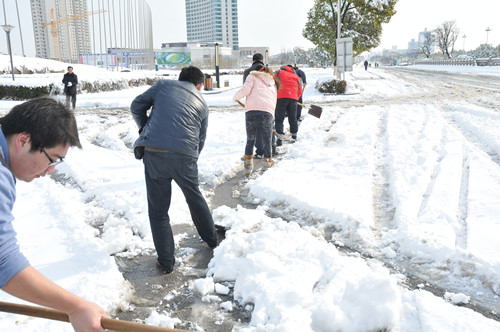 公司總部組織員工上路清掃積雪 時(shí)間:2013-02-19 4167 2月18日至19日凌晨,揚(yáng)州出現(xiàn)低溫降雪災(zāi)害天氣,降下了多年罕見(jiàn)的一場(chǎng)大雪,壓垮樹(shù)枝和部分房屋設(shè)施,并造成道路交通不便。19日清晨,公司響應(yīng)市政府號(hào)召,組織20余名員工上路清掃積雪,公司領(lǐng)導(dǎo)吳士茂、錢(qián)啟明親自參加,與大家共同會(huì)戰(zhàn)2個(gè)多小時(shí),完成了清掃任務(wù)。 厚重的積雪壓垮樹(shù)枝