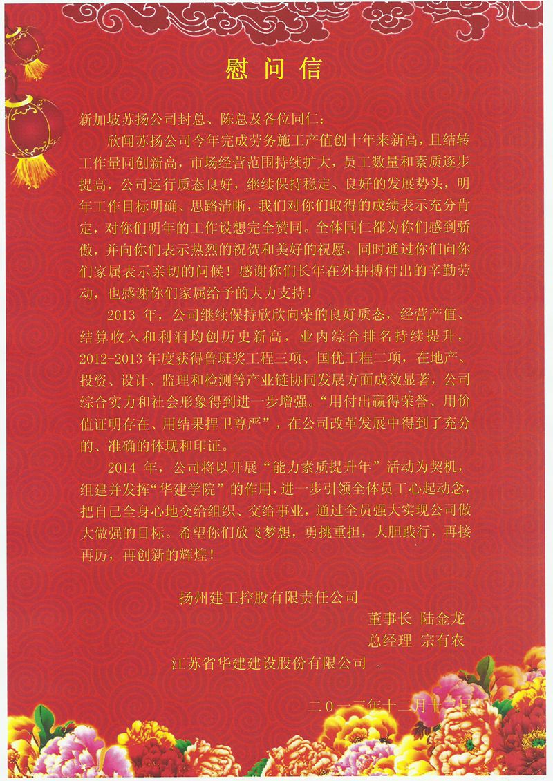 公司董事長、總經理發慰問信鼓勵新加坡蘇揚公司再接再厲 時間:2013-12-13 3617 12月中上旬,公司總部完成了對國內各區域公司的年終走訪調研。新加坡蘇揚公司則通過電子稿匯報了2013年工作情況及下年度工作思路。2013年新加坡蘇揚公司主要經濟指標創歷史新高;隊伍規模保持穩定;班組承包責任制成果顯著;市場份額持續擴大。總部認為這一年來蘇揚公司保質態,擴市場,穩增長,取得了不俗成績,公司董事長陸金龍、總經理宗有農特發慰問信鼓勵蘇揚公司再接再厲,再創新高!慰問信全文如下: