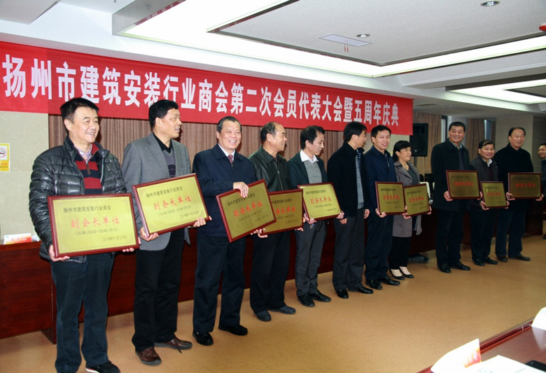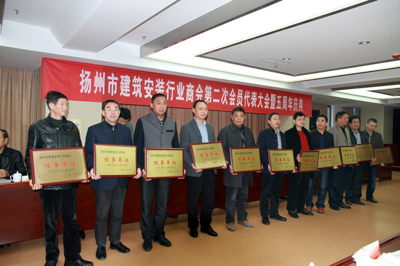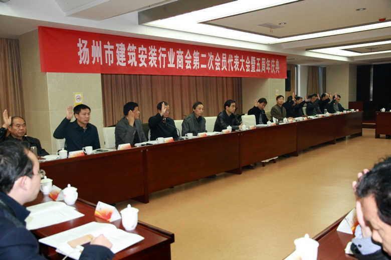 陸金龍主持會員代表大會,第一屆理事會常務(wù)副會長吳士茂作了工作報告,吳士茂作為第二次會員代表大會籌備小組負(fù)責(zé)人還作了關(guān)于商會換屆選舉情況的說明。大會通過舉手表決的方式選舉產(chǎn)生了第二屆理事會和理事會領(lǐng)導(dǎo)機構(gòu)。36名理事組成第二屆理事會,陸金龍連任當(dāng)選第二屆理事會會長,吳士茂任常務(wù)副會長,曹德榮等9名同志任副會長。趙振東宣讀了市工商聯(lián)、總商會關(guān)于同意揚州市建筑安裝行業(yè)商會換屆選舉結(jié)果的批復(fù)。大會舉行了會長單位、副會長單位和理事單位授牌儀式。任壽松代表兄弟友好商會、張紹華代表市民政局分別致賀辭。