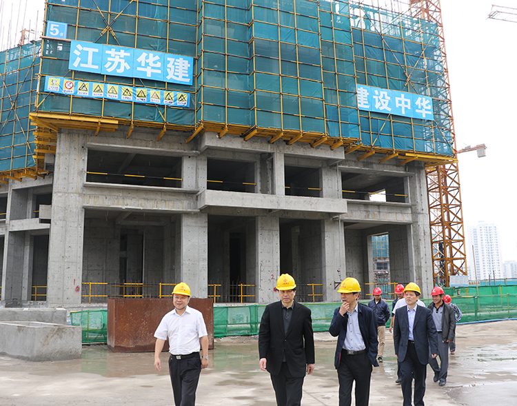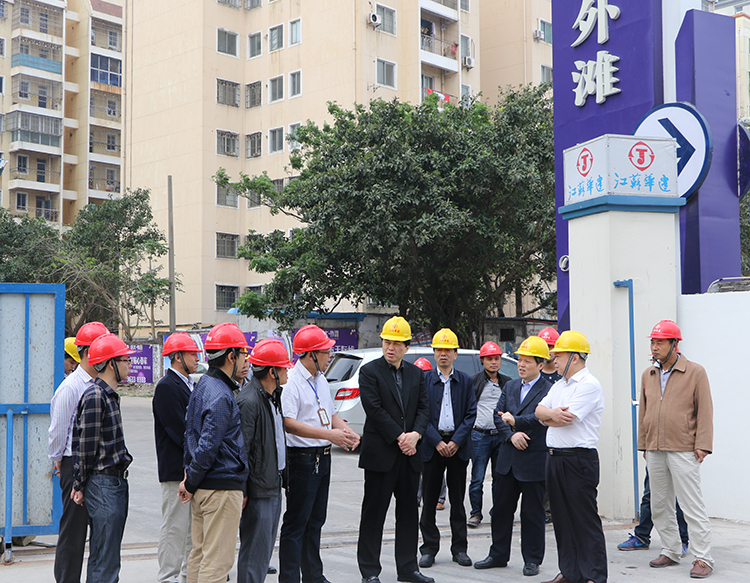 在公司承建的恒大外灘中心施工現(xiàn)場(chǎng),朱市長與項(xiàng)目管理人員一一握手,向大家表示親切問候。在陪同人員引導(dǎo)下,他饒有興致地邊走邊看,聽取項(xiàng)目負(fù)責(zé)人對(duì)工程特點(diǎn)、工程進(jìn)展、工程用材等方面的情況匯報(bào),不時(shí)點(diǎn)頭稱贊施工人員的工藝水平和施工技藝,并與項(xiàng)目部主要管理班子親切合影。