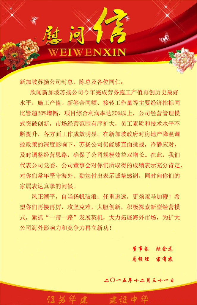 公司董事長、總經(jīng)理發(fā)慰問信勉勵(lì)新加坡蘇揚(yáng)公司再接再厲再立新功