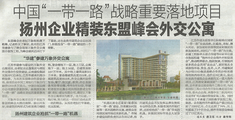 9月12日《揚州晚報》刊載華建東盟峰會外交公寓項目消息 時間:2016-09-12 3977 近日,東盟峰會在老撾萬象剛剛落下帷幕。9月12日,《揚州晚報》A7版刊載題為《中國“一帶一路”戰略重要落地項目 揚州企業精裝東盟峰會外交公寓》的文章,詳細報道華建積極踐行國家“一帶一路”戰略,承建東盟峰會場館萬象外交公寓精裝修工程的有關情況。