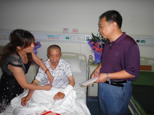 7月13日上午,江蘇華建副總經(jīng)理、宜昌市揚(yáng)州商會(huì)會(huì)長王宏、宜昌分公司總經(jīng)理呂進(jìn)、第一工程處主任唐生健等一行,前往市二醫(yī)院看望香格里拉小區(qū)保安——英雄付永喜,并給他送去了慰問金。