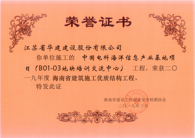 近日,海南省建設工程質量安全監測協會發文表彰了一批2019年度上半年海南省建筑施工優質結構工程,江蘇華建海南分公司承建的3個項目上榜,分別是:三亞奧林匹克廣場項目、中國電科海洋信息產業基地項目(B01-03地塊培訓交流中心)項目、景園悅海灣二期南區23#樓項目。