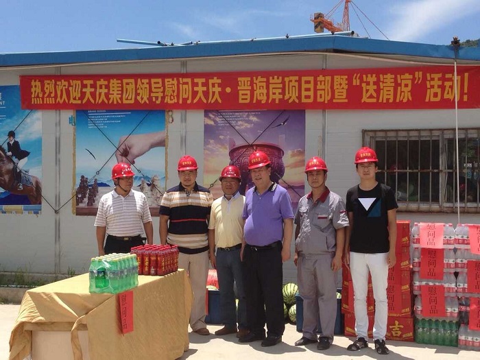 千里送清涼——天慶集團(tuán)董事長韓慶慰問我司一線職工 時間:2015-08-05 4100 8月4日中午,烈日當(dāng)空,驕陽似火。甘肅天慶房地產(chǎn)集團(tuán)有限公司董事長韓慶一行不遠(yuǎn)千里來到廣東珠海,頂著烈日,冒著酷暑,在項(xiàng)目負(fù)責(zé)人陳建的陪同下,慰問我司承建的“天慶·晉海岸”項(xiàng)目一線施工人員,給工人們送來了西瓜、礦泉水、王老吉等飲品和深情問候,讓廣大一線職工在炎炎烈日下感受到陣陣清涼。