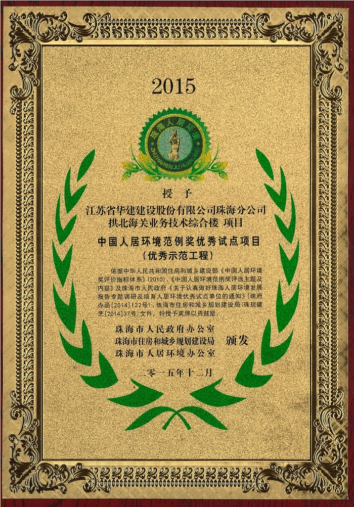 公司榮獲珠海市人居環境建設突出貢獻單位等四項表彰 時間:2015-12-22 4282 近日,珠海公司被珠海市人民政府辦公室、珠海市住房和城鄉規劃建設局和珠海市人居環境辦公室聯合表彰為珠海市人居環境建設突出貢獻單位(優秀建筑施工企業),繆國樞總經理被授予珠海市人居環境建設突出貢獻個人稱號,由我公司承建的拱北海關業務技術綜合樓及南福·錦園項目榮獲中國人居環境范例獎優秀試點項目(優秀示范工程)。