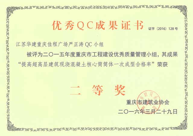公司新增2項省級QC成果 時間:2016-04-06 4126 近日,重慶市建筑業協會發文表彰了一批優秀QC成果,公司重慶佳程廣場項目嚴正濤、沈正祥QC小組被評為2015年度重慶市工程建設優秀質量管理小組,其成果“提高超高層建筑現澆混凝土核心筒筒體一次成型合格率”、“提高鋼筋機械套筒連接合格率”等均榮獲二等獎。