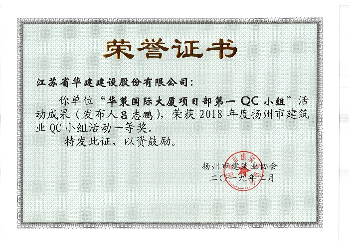 近期,揚(yáng)州市建筑行業(yè)協(xié)會(huì)公布了2018年度揚(yáng)州市工程建筑業(yè)優(yōu)秀QC小組活動(dòng)成果評(píng)比結(jié)果,公司共有9項(xiàng)成果受到表彰。其中,華策國(guó)際大廈項(xiàng)目部QC小組“設(shè)備機(jī)房減振降噪的創(chuàng)新方法”成果榮獲一等獎(jiǎng);華策國(guó)際大廈項(xiàng)目部QC小組“提高鋼結(jié)構(gòu)工程高強(qiáng)螺栓安裝合格率”、威麗詩(shī)花園一期QC小組“降低地下室主體結(jié)構(gòu)滲水率”和再生時(shí)代項(xiàng)目部QC小組“提高超高層空間鋼柱安裝精度”三篇成果榮獲二等獎(jiǎng);華策國(guó)際大廈項(xiàng)目部QC小組“提高輕質(zhì)隔墻板施工質(zhì)量”及“提高超高層外包薄壁鋼板混凝土組合剪力墻安裝精度”、再生時(shí)代項(xiàng)目部QC小組“提高綠色施工驗(yàn)收管理評(píng)價(jià)工作質(zhì)量”三篇成果榮獲三等獎(jiǎng);威麗詩(shī)花園二期QC小組“提高混凝土外觀質(zhì)量”和陽(yáng)光馬德里QC小組“鋁合金模板混凝土表面氣泡控制”兩篇成果榮獲優(yōu)秀獎(jiǎng)。