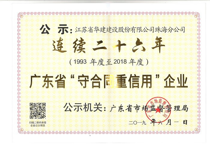 公司連續(xù)二十六年被廣東省市場(chǎng)監(jiān)督管理局表彰為“守合同重信用企業(yè)” 時(shí)間:2019-07-01 3295 近日,珠海分公司被廣東省市場(chǎng)監(jiān)督管理局(原公示機(jī)關(guān)為廣東省工商行政管理局)授予“連續(xù)二十六年守合同重信用企業(yè)”榮譽(yù)稱號(hào)。