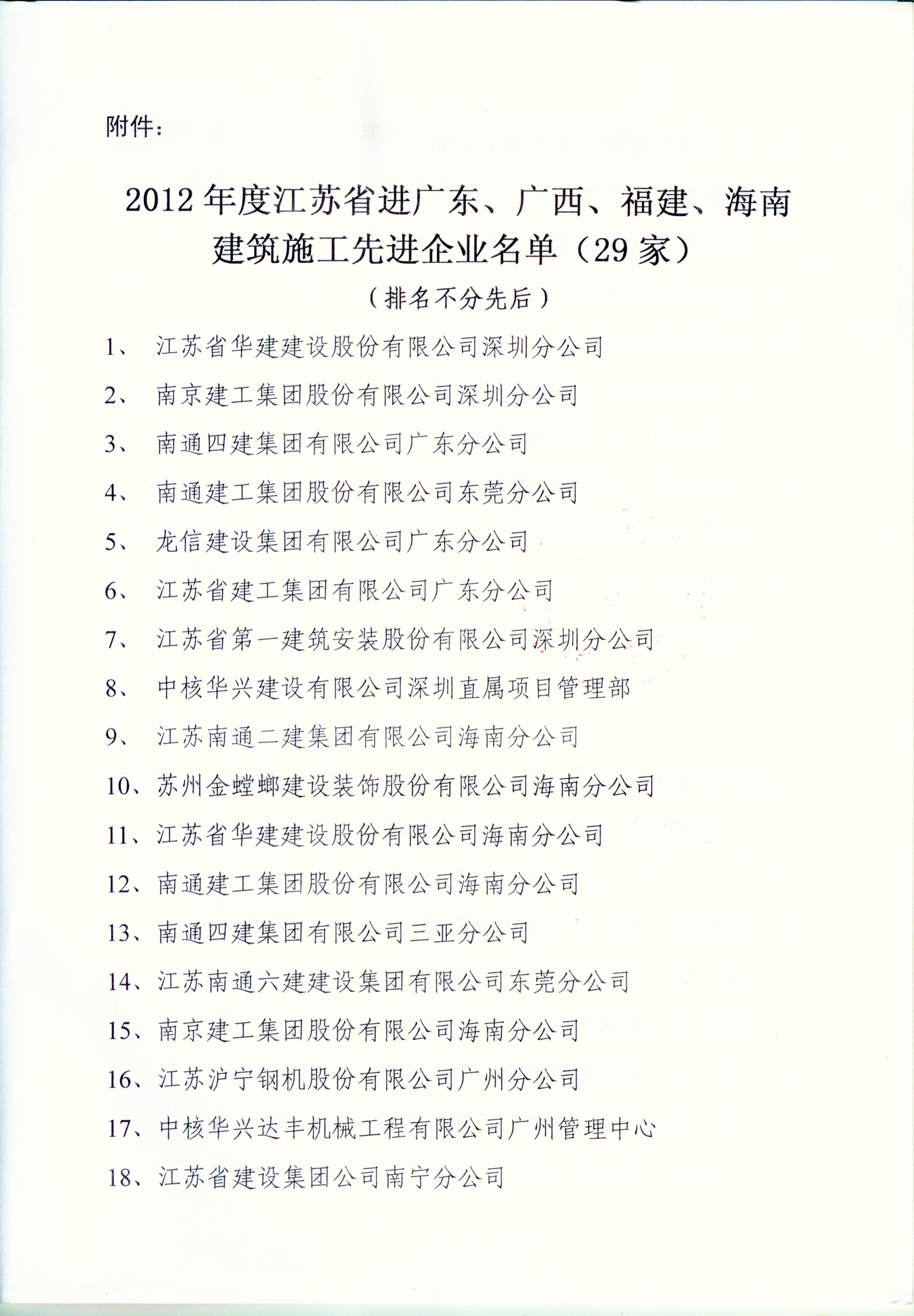 2012年江蘇進粵、桂、閩、瓊建筑施工先進企業(yè)、優(yōu)秀企業(yè)經(jīng)理、優(yōu)秀建造師及經(jīng)營財務(wù)管理、質(zhì)量安全管理先進個人 時間:2013-03-18 4229