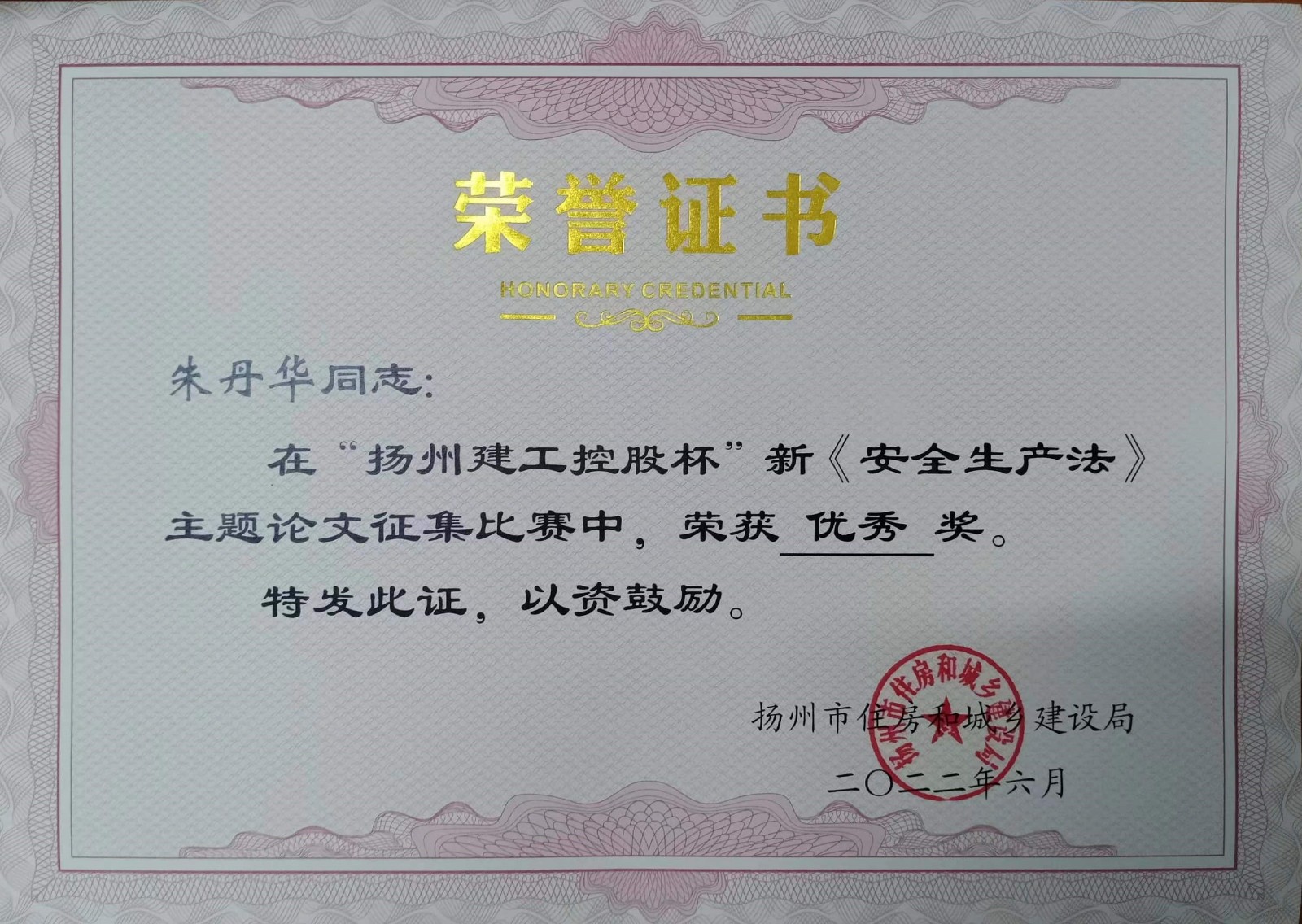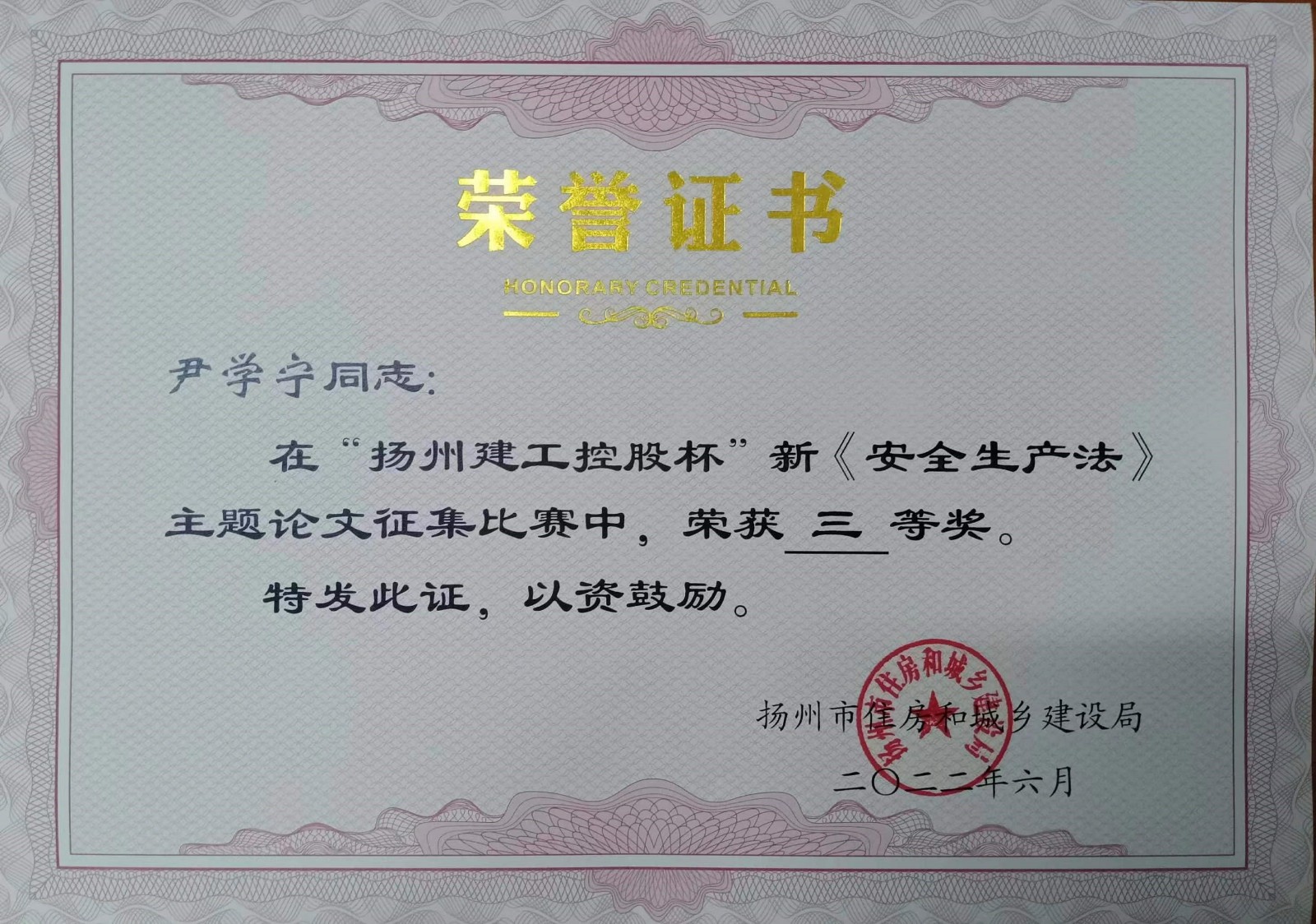 北京分公司4篇論文獲揚州市新《安全生產法》主題論文征文比賽獎項 時間:2022-07-16 3810 近日,從揚州市住房和城鄉建設局傳來喜訊,由北京公司投稿的4篇論文榮獲“揚州建工控股杯”新《安全生產法》主題論文征文比賽獎項,并獲頒證書,其中一等獎一項,三等獎一項,優秀論文獎兩項。