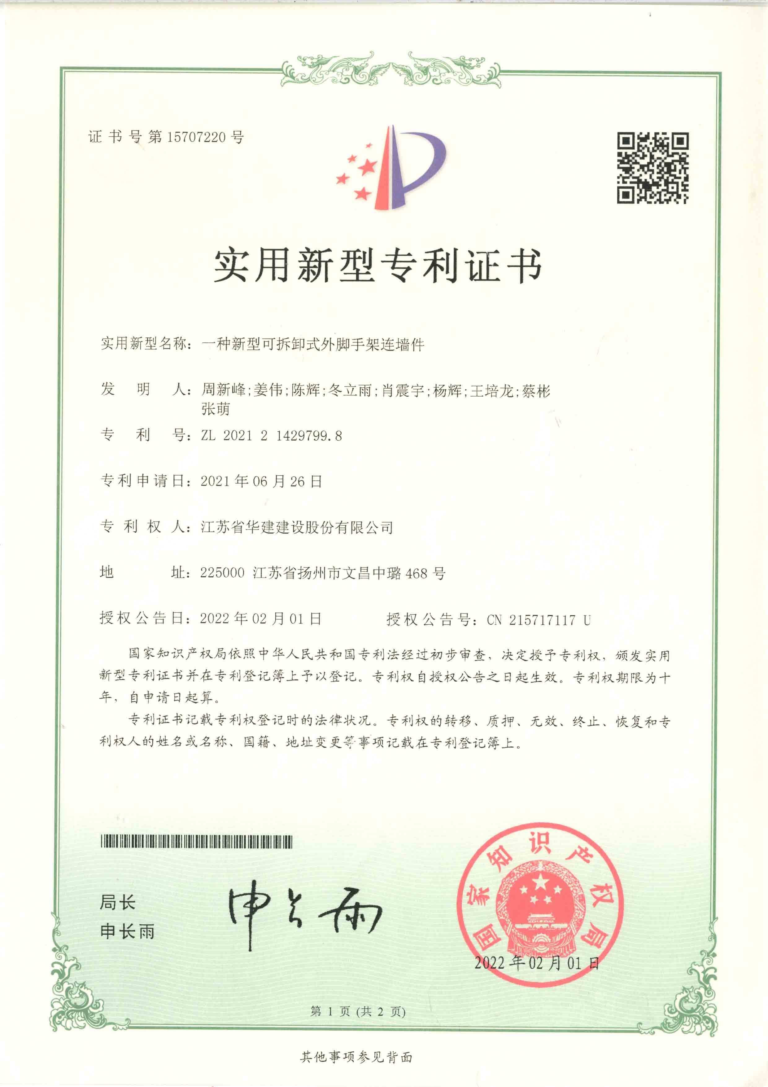 北京分公司2022年度已取得兩項實用新型專利證書 時間:2022-08-22 3670 日前,國家知識產權局頒發了實用新型專利證書,公司兩項專利取得實用新型專利證書,分別是:一種新型可拆卸式外腳手架連墻件、一種鋼筋混凝土現澆板板厚高精度控制裝置。